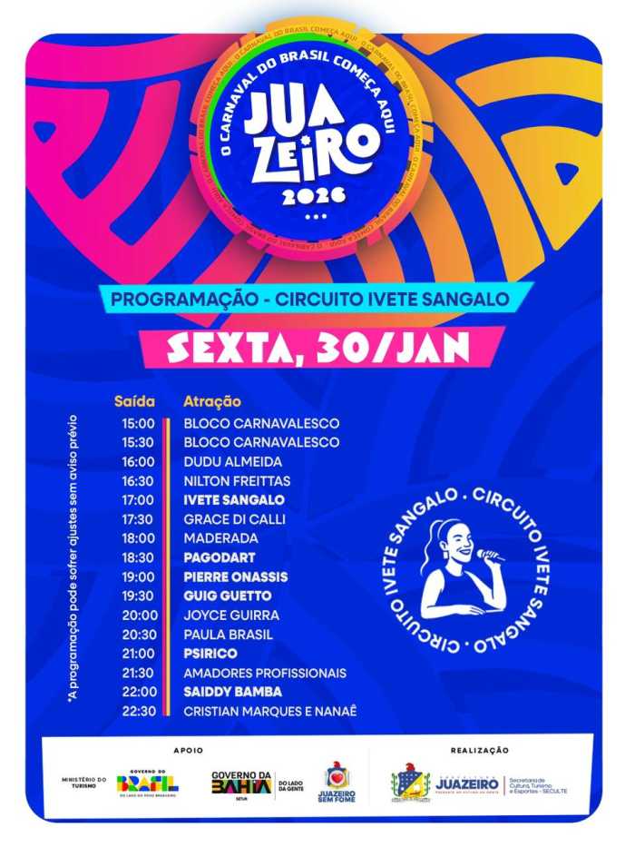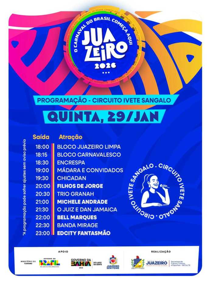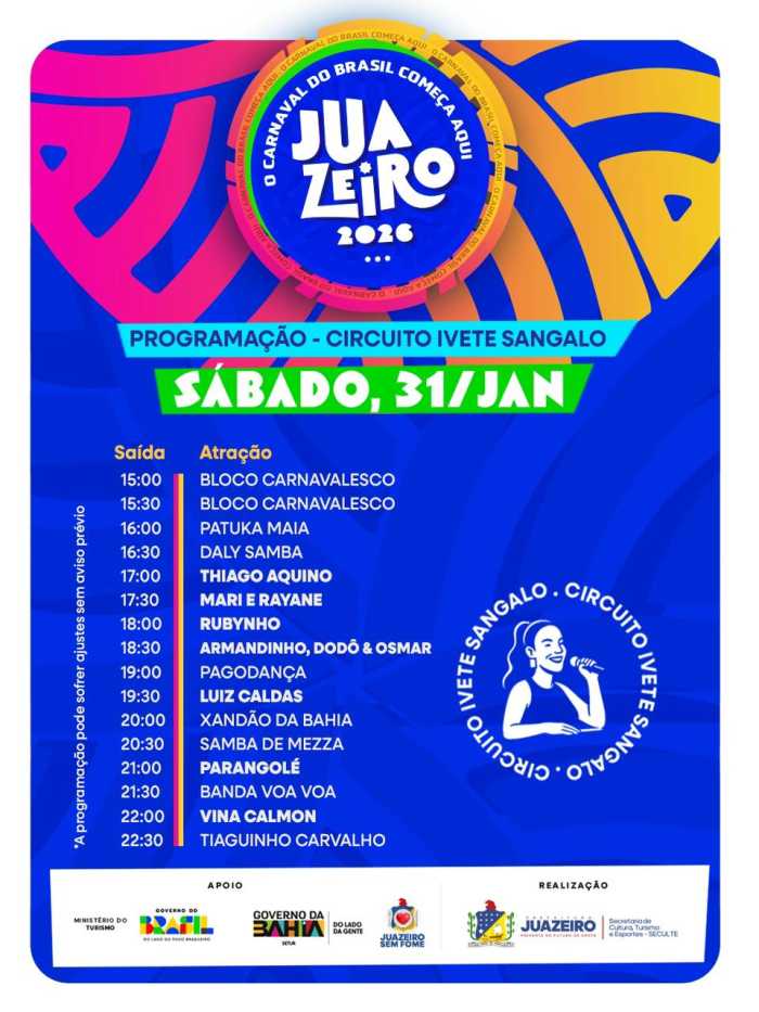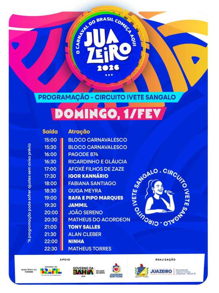 JuazeiroJuazeiro anuncia programação oficial do Circuito Ivete Sangalo no Carnaval 2026 O suspense acabou! Juazeiro apresenta a programação oficial do Circuito Ivete Sangalo, principal circuito do Carnaval de Juazeiro 2026, a festa que abre o Carnaval do Brasil com muita identidade... Por Rafael21/01/2026 - 10h40 O suspense acabou! Juazeiro apresenta a programação oficial do Circuito Ivete Sangalo, principal circuito do Carnaval de Juazeiro 2026, a festa que abre o Carnaval do Brasil com muita identidade, diversidade musical e grandes encontros às margens do Velho Chico. Serão dias de folia intensa na Orla I e na Avenida Adolfo Viana, reunindo tradição, grandes nomes da música e a energia que só Juazeiro tem.Ao todo, mais de 50 atrações passam pelo Circuito Ivete Sangalo entre quinta (29) e domingo (1º), em uma verdadeira maratona musical que celebra o axé, o pagode, o samba, o arrocha e os ritmos que embalam o povo baiano. O circuito recebe artistas consagrados e ídolos populares, com destaque para Ivete Sangalo, símbolo da música baiana e ícone que leva Juazeiro para o mundo, além de atrações como Bell Marques, Igor Kannário, Psirico, Parangolé, Jammil, Rafa e Pipo Marques, Filhos de Jorge, Luiz Caldas, Armandinho, entre muitos outros.A expectativa é de que cerca de 100 mil pessoas por noite acompanhem a festa no circuito, movimentando a economia local, fortalecendo o turismo e reafirmando Juazeiro como referência nacional quando o assunto é Carnaval fora de época. Aqui, a folia começa mais cedo e mostra para o Brasil que o Carnaval nasce forte, plural e vibrante às margens do Velho Chico. carnavaljuazeirojuazeiro-bacarnval-bahia COMENTÁRIOSEfetue o Login ou Cadastre-se para participar.